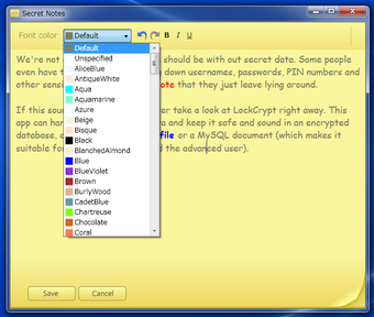 Secret Notesはテキスト色変更、太字・斜体処理(斜体はローマ字のみ)、下線を引くなどの簡単な編集機能もありますので、自分が大事だと思った部分や後で集中して見直したい部分を忘れずに記録できます。一度保存した文書を再び編集したい場合は、サムネイルをクリックすると入力モードになります。ウィンドウを閉じると自動でロックがかかり、再びウィンドウを開く際にはパスワード入力が必要となります。間違ったパスワードを入力すると、保存したノートを開けないのはもちろん、新規作成もできない状態になるので安心です。